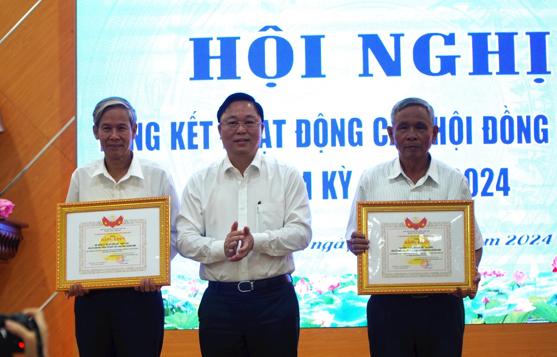 Chủ tịch Ủy ban MTTQ Việt Nam tỉnh Lê Trí Thanh trao Bằng khen của Ủy ban MTTQ Việt Nam tỉnh cho 2 tập thể có thành tích xuất sắc trong hoạt động tư vấn nhiệm kỳ 2019 - 2024. Ảnh: TÂM ĐAN